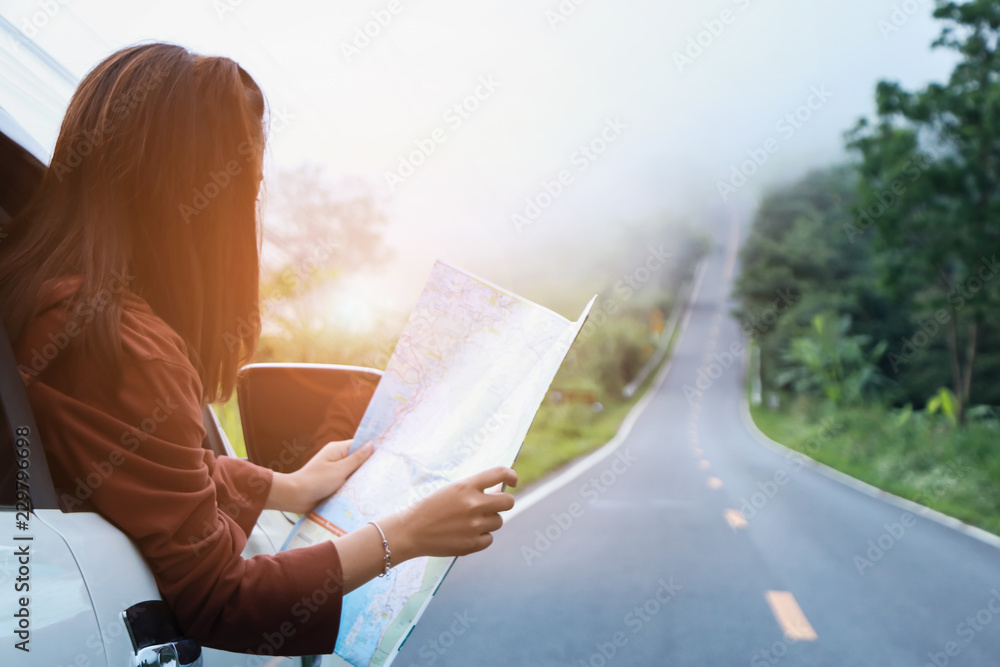 women travel relax in the holiday. traveling by car with trendy look searching direction on location map park. happily With nature, rural forest. #229796698