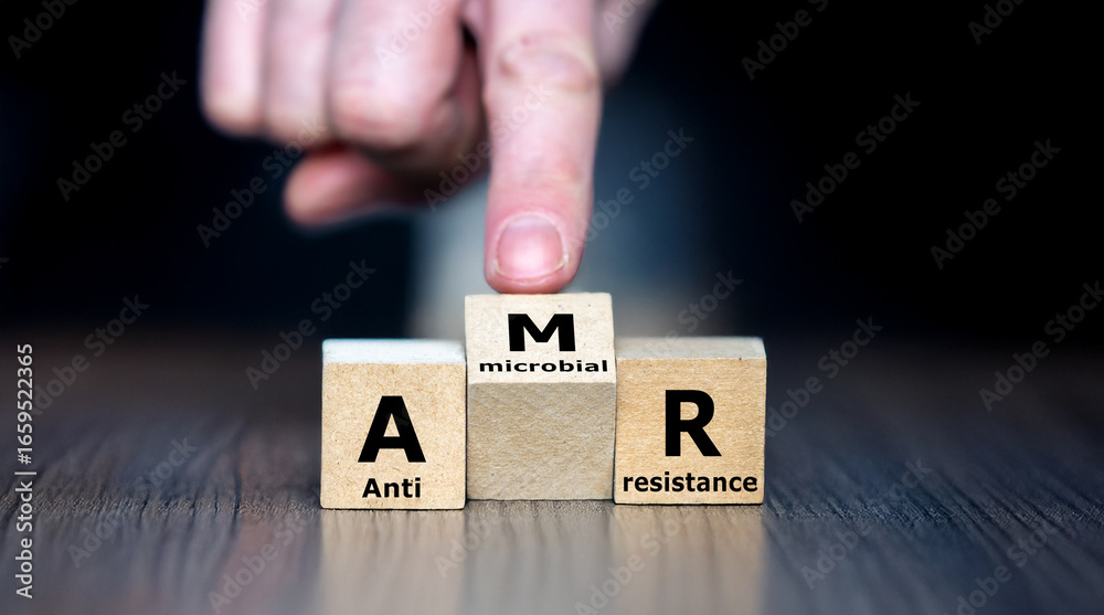 Wooden cubes showing the acronym AMR for antimicrobial resistance, symbolizing healthcare, microbiology, drug resistance, and global health awareness in a medical context. #1659522365