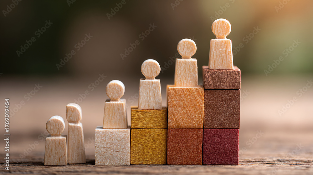 Wooden figurines ascend a staircase-like structure, symbolizing progress and hierarchy. The arrangement suggests growth and development, with figures positioned at varying levels #1769019454