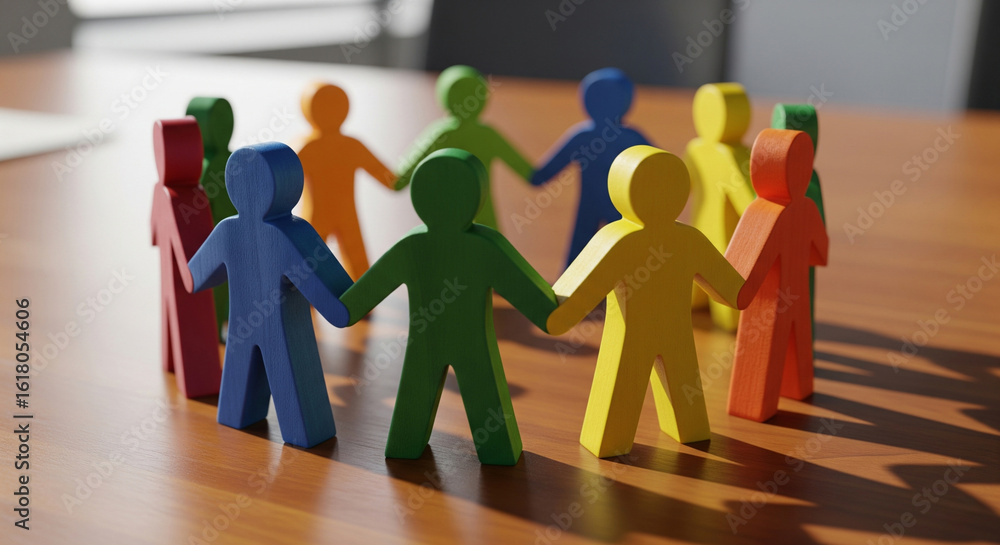 Wooden people figures of different colors holding hands, inclusive business thinking, values of dignity and respect for all people, teamwork #1618054606