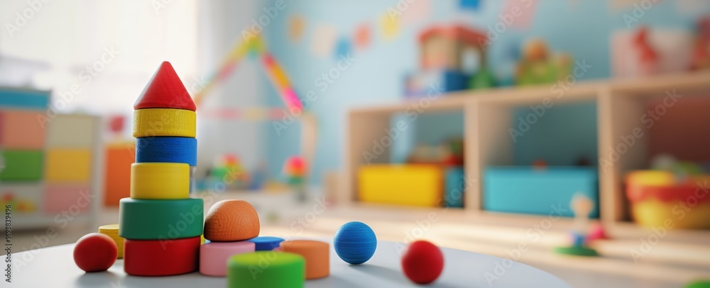 Wooden Toy Car and Colorful Blocks Tower on a Table in Daycare. #1698839496