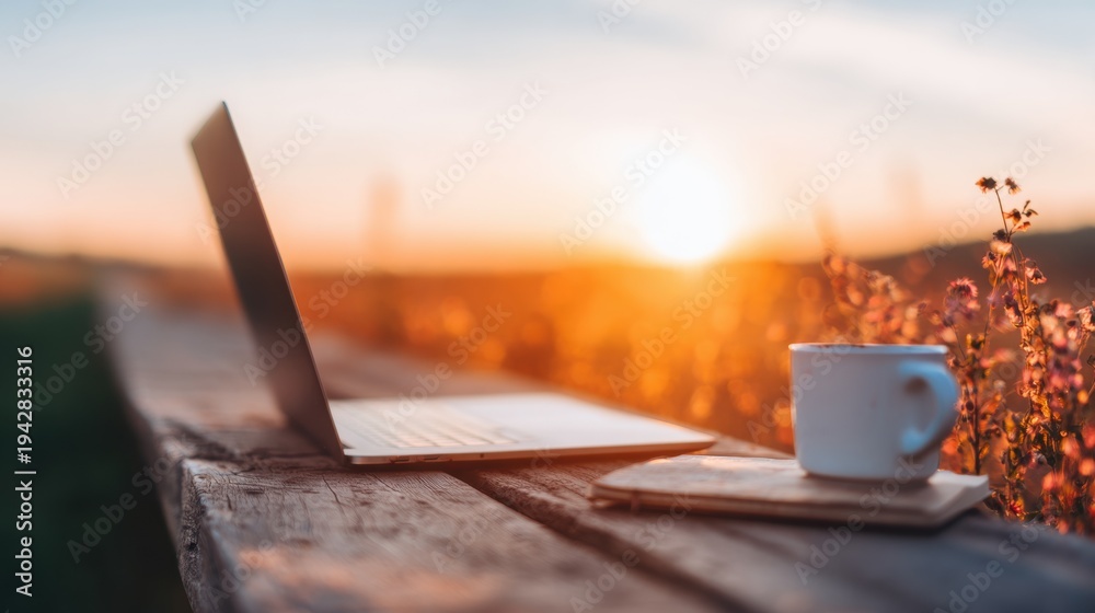 Working with a laptop and coffee during sunset by a flower field #1942833316