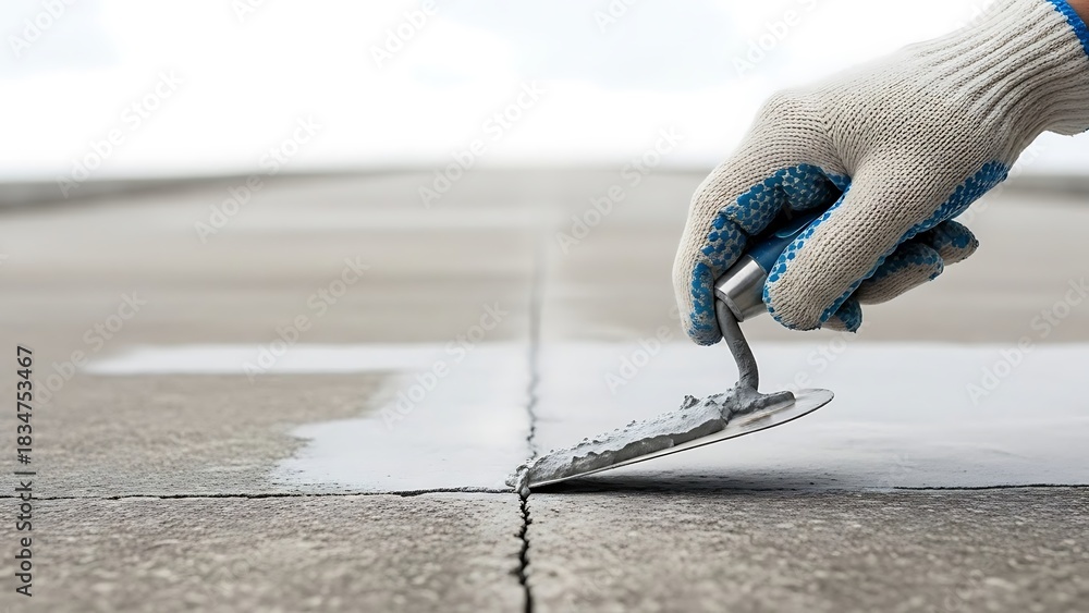 Workman Smoothing Grout into Concrete Crack with Trowel for Construction #1834753467
