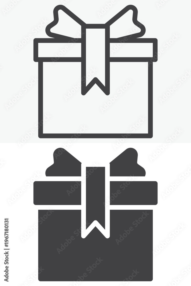 Wrapped birthday gift box with bow icon in line and solid styles. Outline and solid icon, editable stroke vector sign symbol. Gift box icon for party design. #1967180131