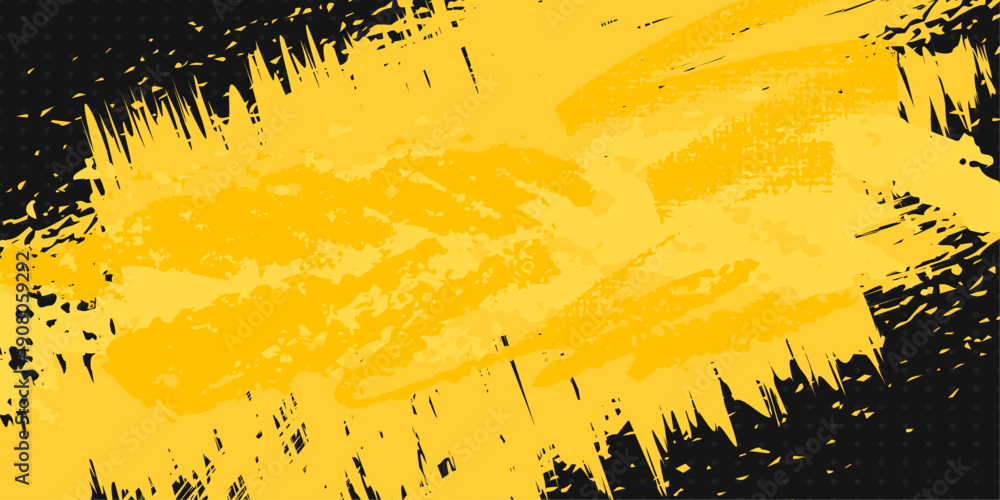 Yellow Abstract Grunge Brush Stroke Background Black Dotted Pattern Industrial Graffiti Vector Banner #1908059292