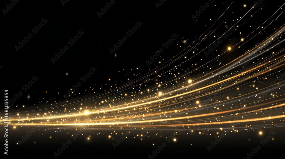 Yellow and white shooting star trails on transparent background. Vector realistic illustration of firework arc tails with shimmering particles, festive sparkling beams, magic power twinkle effect #1681035954