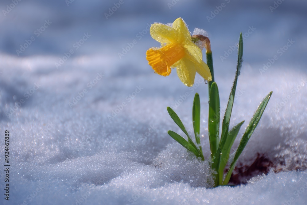 Yellow daffodil emerging through snow, symbolizing resilience and hope #1924167839