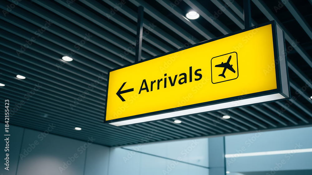 Yellow illuminated arrivals sign with airplane icon and directional arrow in airport terminal #1842155423