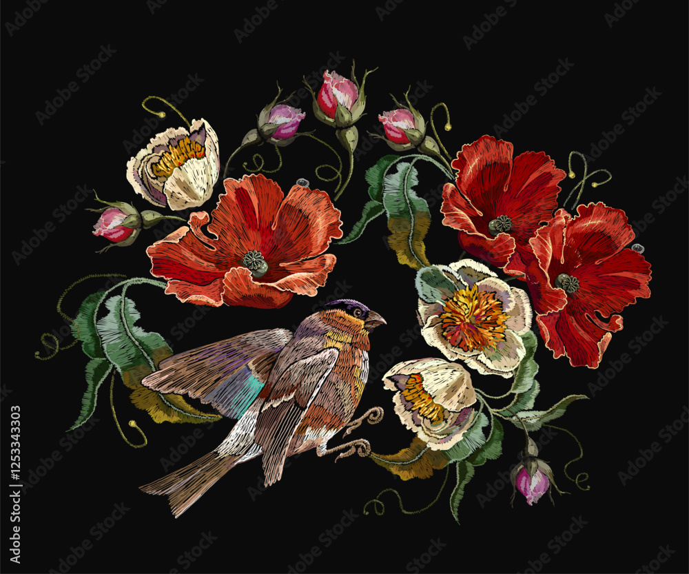 Yellow peonies flowers, red poppies and birds. Fashion summer template for clothes, t-shirt design. Embroidery floral art style #1253343303