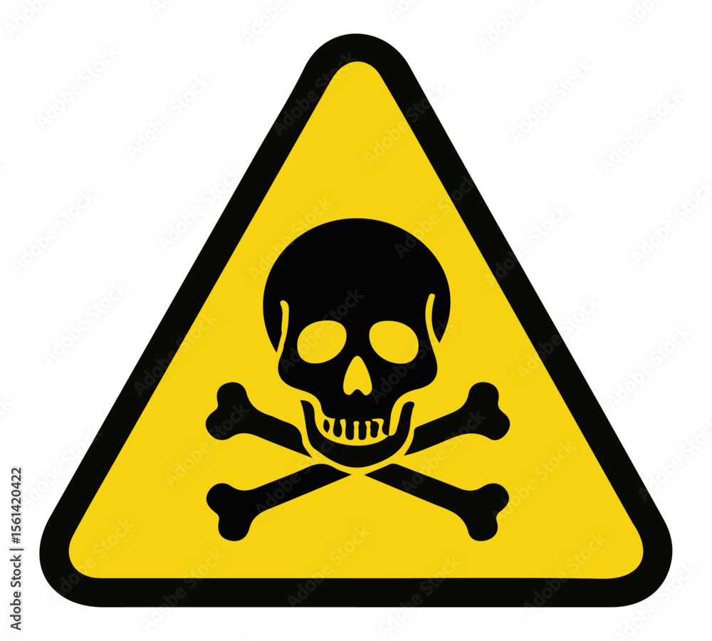 Yellow Skull and Crossbones / Poison Hazard Warning Sign. Yellow triangular warning sign with a black skull and crossbones, indicating poison, toxic substances, or extreme danger #1561420422