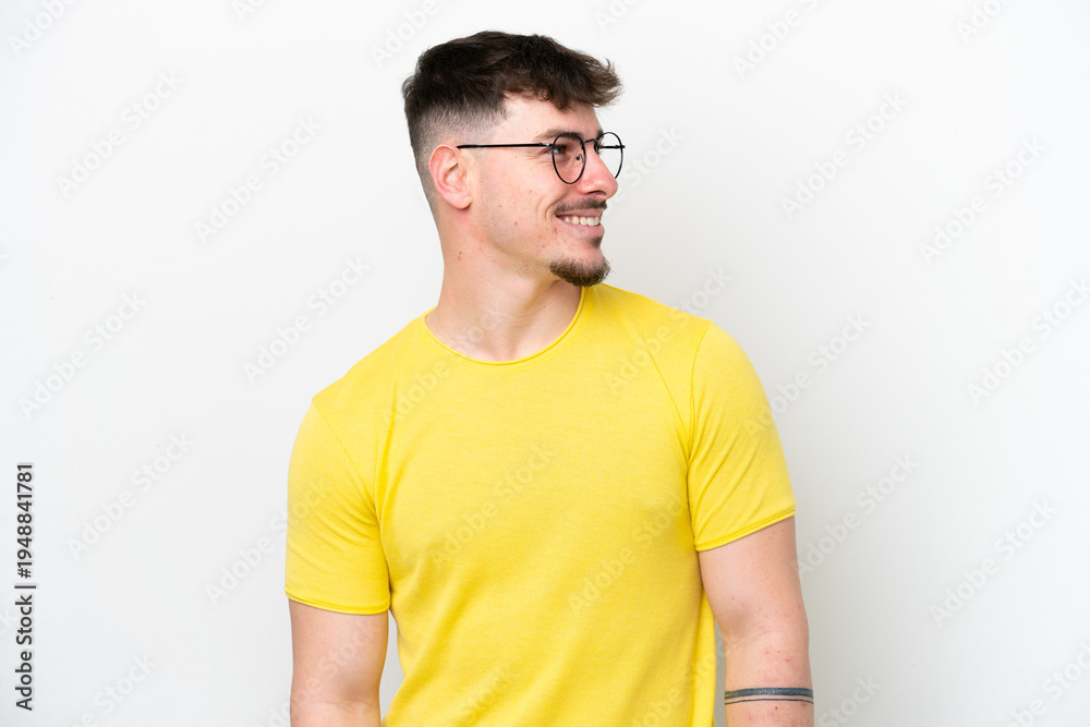 • #1948841781 Young caucasian handsome man isolated on white background looking side