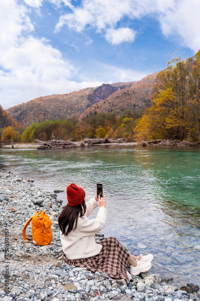Young female tourist enjoying and taking a photo with beautiful autumn at kamikochi in Japan #1731630037