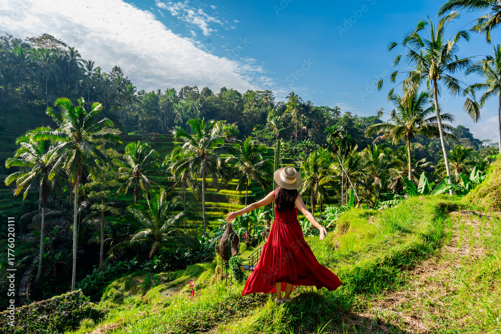 Young female tourist in red dress looking at the beautiful tegalalang rice terrace in Bali, Indonesia #1776020111