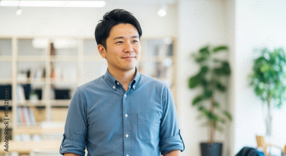 Young man in casual shirt, smiling in modern office environment #1781210391