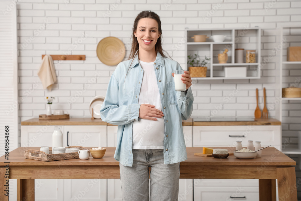 Young pregnant woman with different dairy products on table in kitchen #1849554668