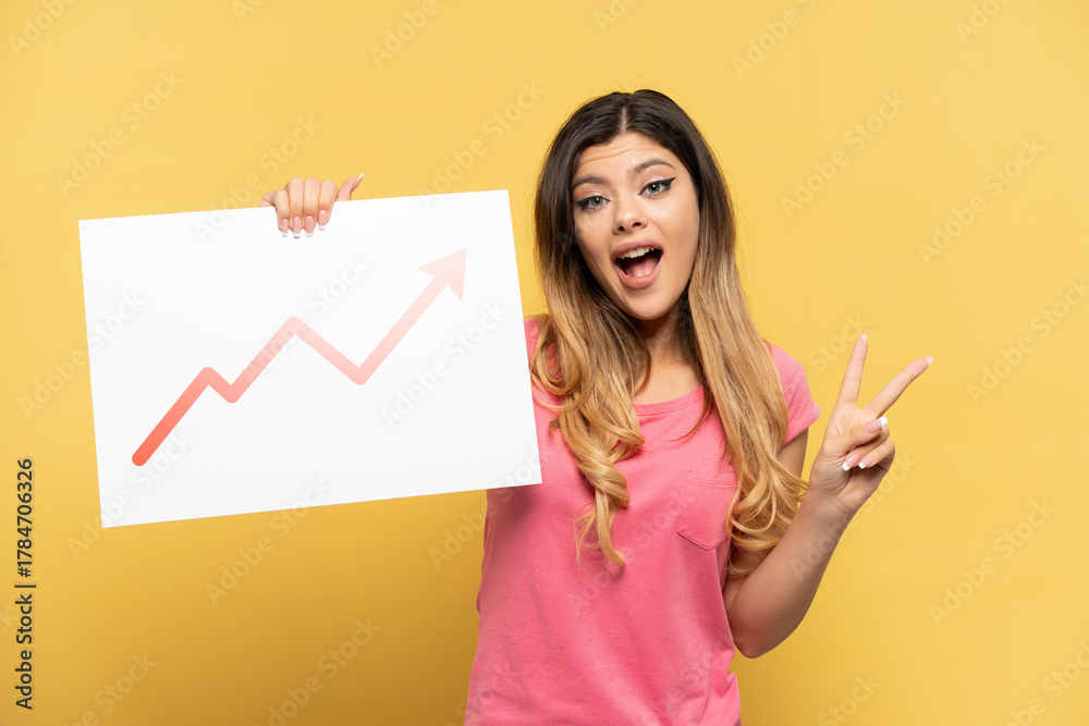 Young Russian girl isolated on yellow background holding a sign with a growing statistics arrow symbol and thinking #1784706326