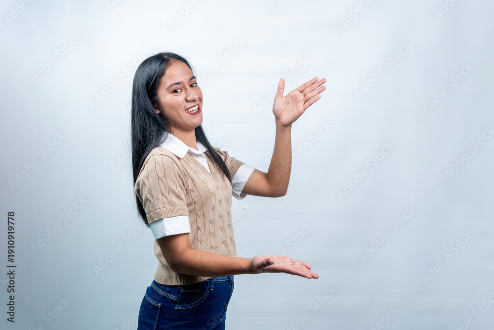 Young Southeast Asian woman in a sweater vest making a presenting gesture with both hands. Professional studio portrait on white background. #1910919778