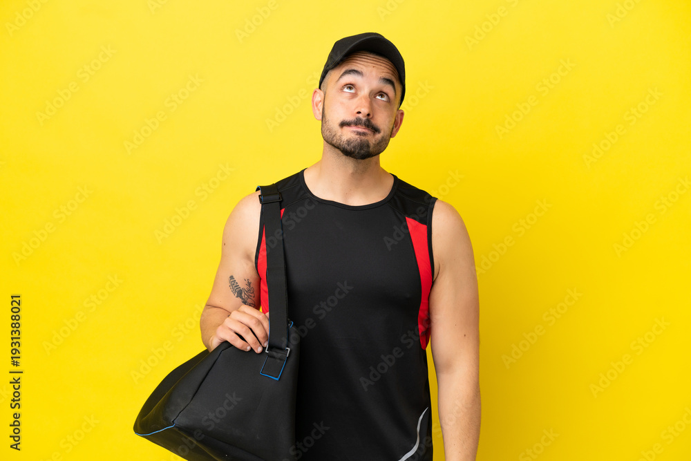 Young sport caucasian man with sport bag isolated on yellow background and looking up #1931388021