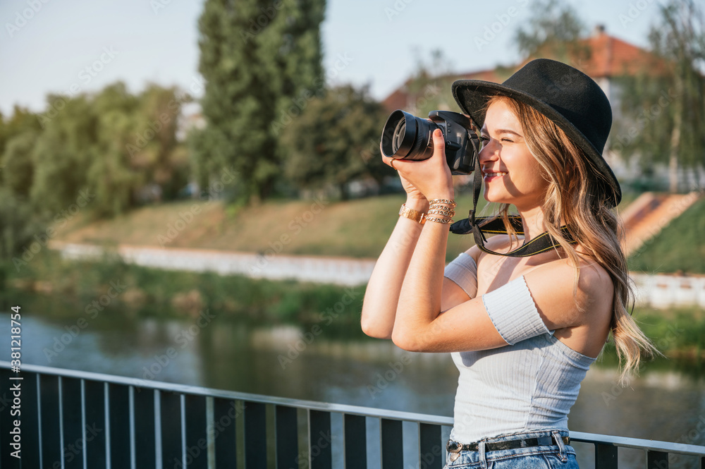 Young tourist woman using her professional camera and taking photos outdoors #381218754
