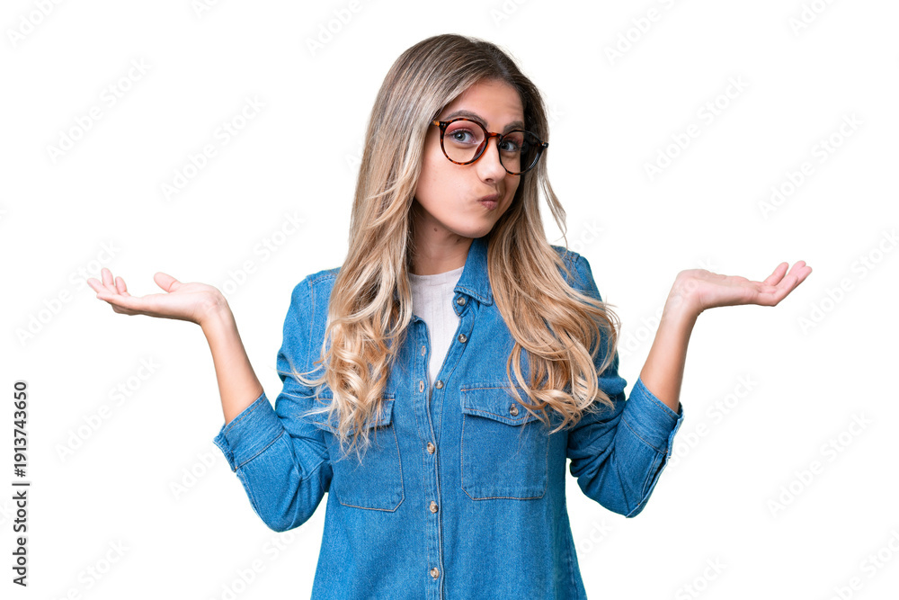Young Uruguayan woman over isolated background having doubts while raising hands #1913743650