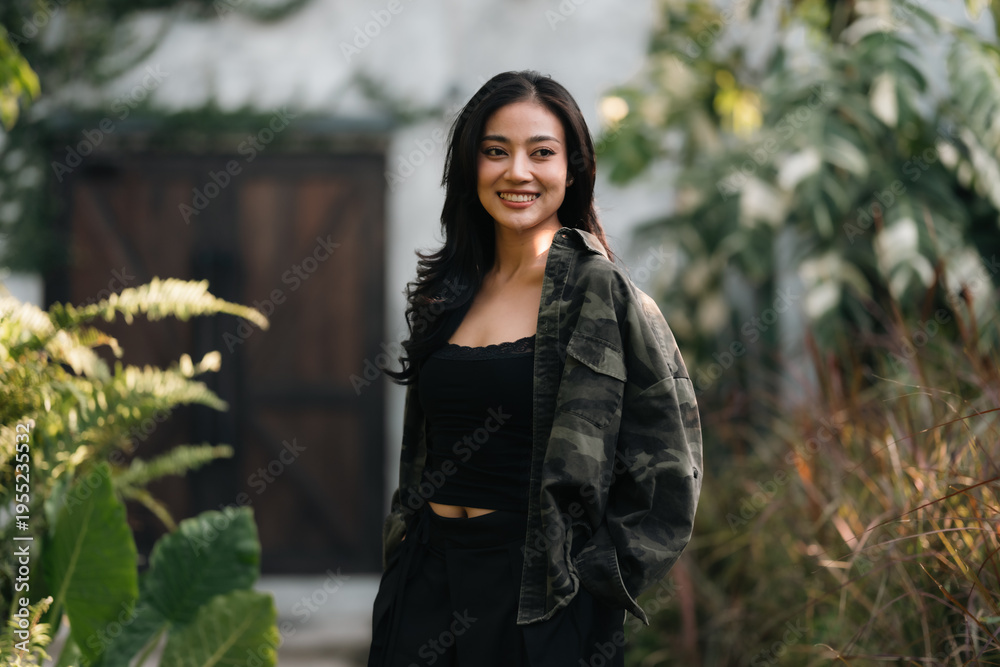 Young woman black hair casual jacket outdoor garden greenery natural light smiling relaxed confident standing foliage nature lifestyle portrait happiness beauty fashionable trendy serene peaceful #1955235532