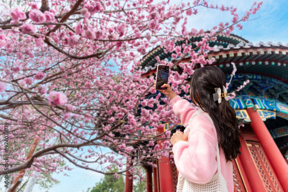 Young woman enjoying spring scenery and taking photos of traditional Chinese architecture with plum blossoming flowers in spring #1974073779