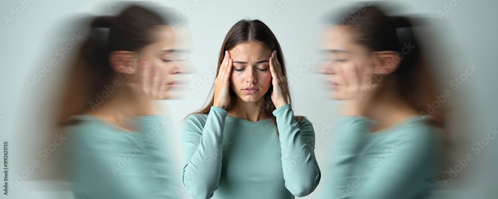 Young woman holds head with hands, eyes closed in pain. Suffers from severe headache, migraine, physical discomfort. Motion blur effect shows overwhelming thoughts, dizziness, mental confusion. #1892621755