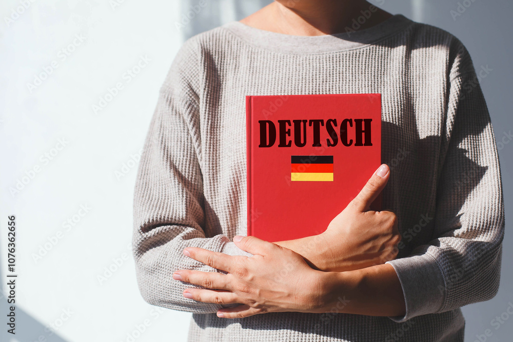 young woman in beige sweater holds red german language textbook with german inscription and german flag, foreign language learning concept. her face is not visible, #1076362656