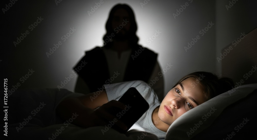 Young woman lying in bed browsing phone in dark with Jesus looking over her. Concept of modern faith, temptation and spiritual reflection. #1726467715