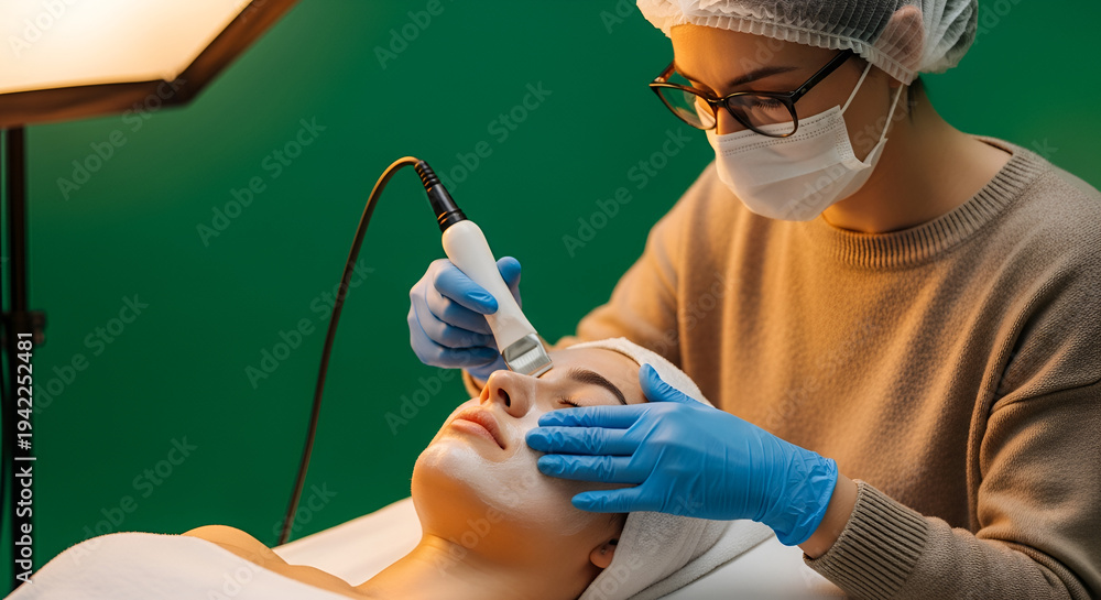 Young Woman Receives Facial Treatment With Device From Aesthetician Wearing Protective Gear Against Green Screen Background In A Brightly Lit Room #1942252481