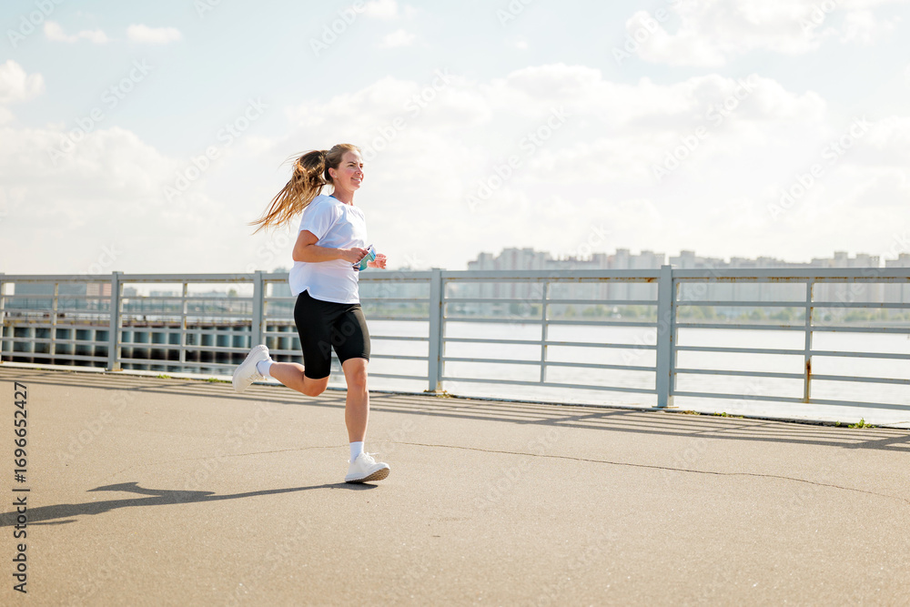 Young woman runs along waterfront path in city, enjoying fitness and fresh air during morning hours #1696652427