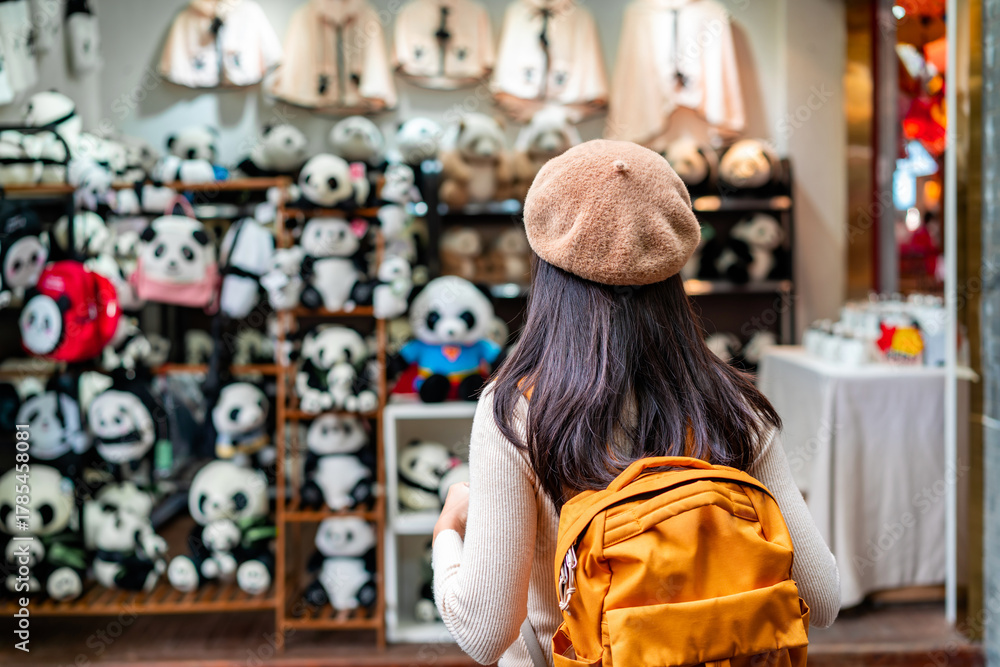 Young woman traveler is shopping at a Panda souvenir shop in Chengdu, China #1785458081