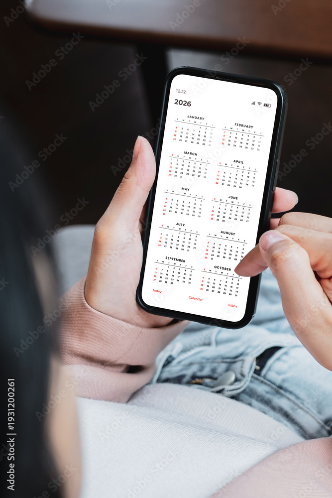 Young woman using smartphone with monthly calendar to plan 2026 activities. Scheduling and organizing plans. Technology and business concept. #1931200261