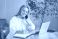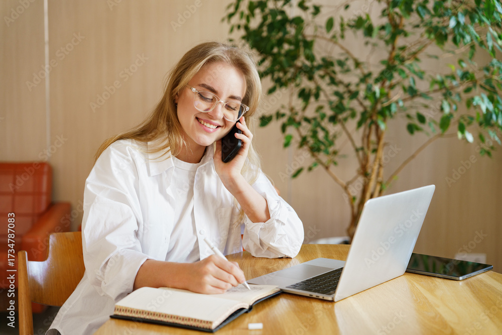 Young woman working on laptop while talking on phone and taking notes #1734787083