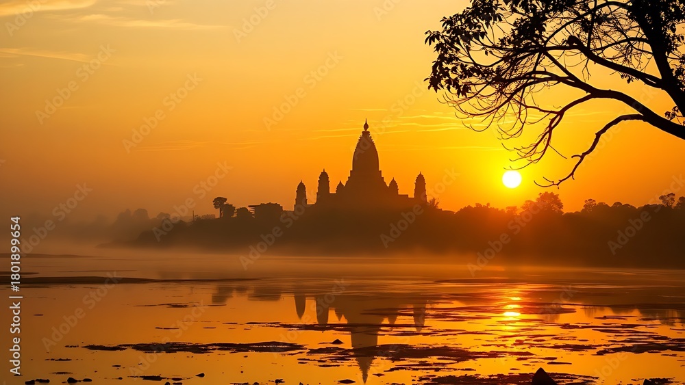 ziggurat. Ziggurat temple silhouette at sunset by a riverbank in misty atmosphere. inspiring travel planning, event programs, designed for cultural heritage projects and event programs. #1801899654