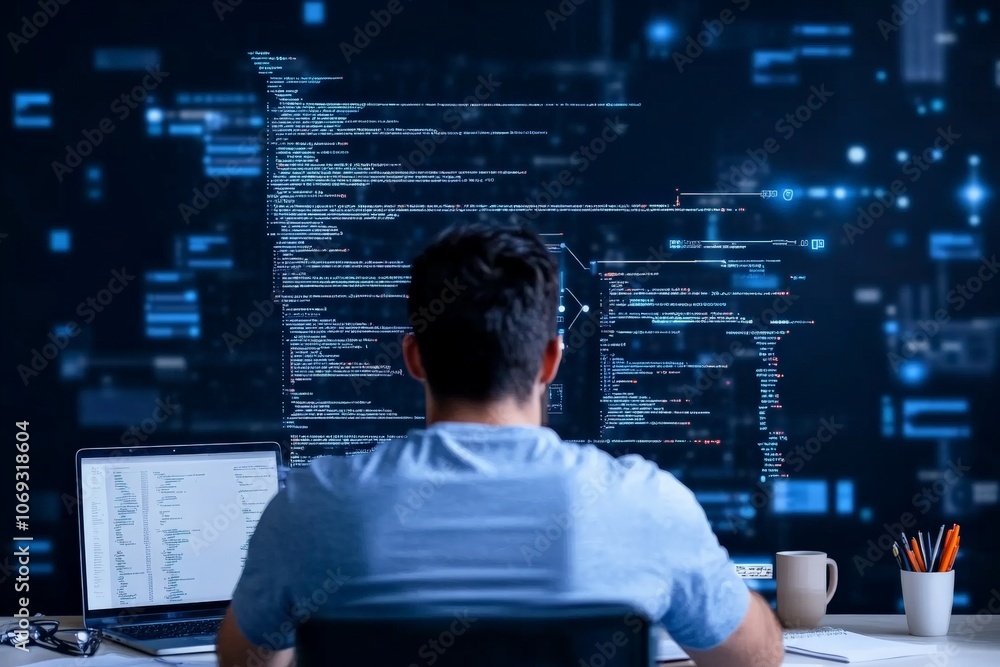A back view of a coder working intently on a programming task, emphasizing technical skills and concentration, showcasing a dynamic digital workspace environment. #1069318604