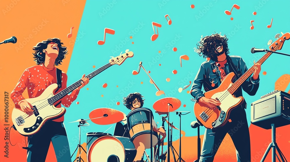 A band of three musicians performing on stage, with a drummer, a bass player, and a guitarist, with musical notes floating above them in a vibrant cartoon style. #1000667317