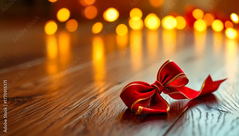 A beautiful red holiday bow on a wood surface with a warm light ambience and is perfect for gift-giving, decor, and seasonal joy. #1770915371