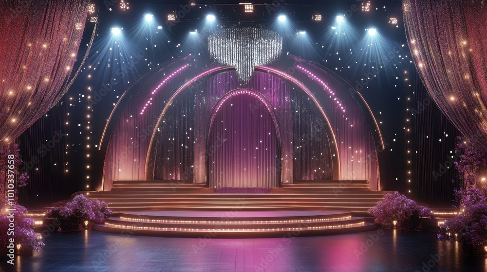 A beauty pageant stage with dazzling lights and refined decor, exuding elegance and sophistication. Realistic, highly detailed #1010337658