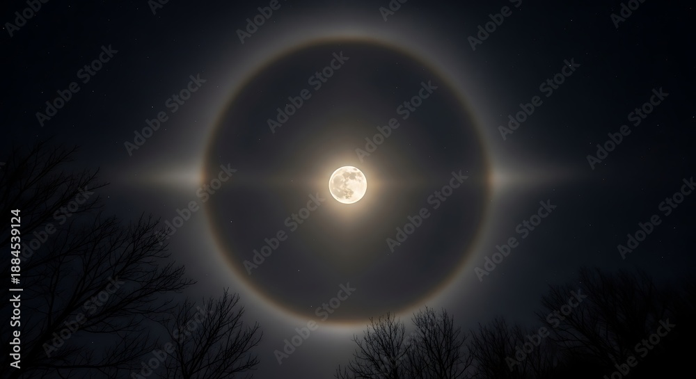 A breathtaking celestial spectacle of a solar eclipse viewed through a halo encircling the moon, set against a dark landscape with silhouetted trees #1884539124