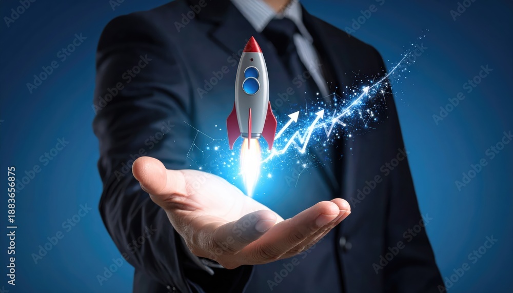 A businessman's hand holds a rocket soaring upwards, symbolizing business growth and success #1883656875