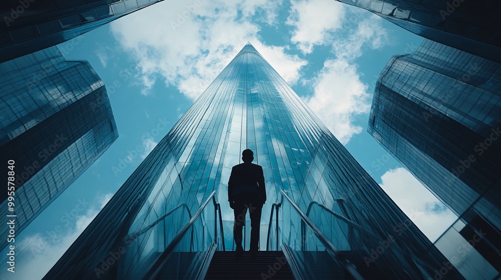 A businessperson ascending an outdoor staircase toward a modern skyscraper symbolizing personal ambition growth and professional success Large space for text in center Stock Photo with copy space #995578840