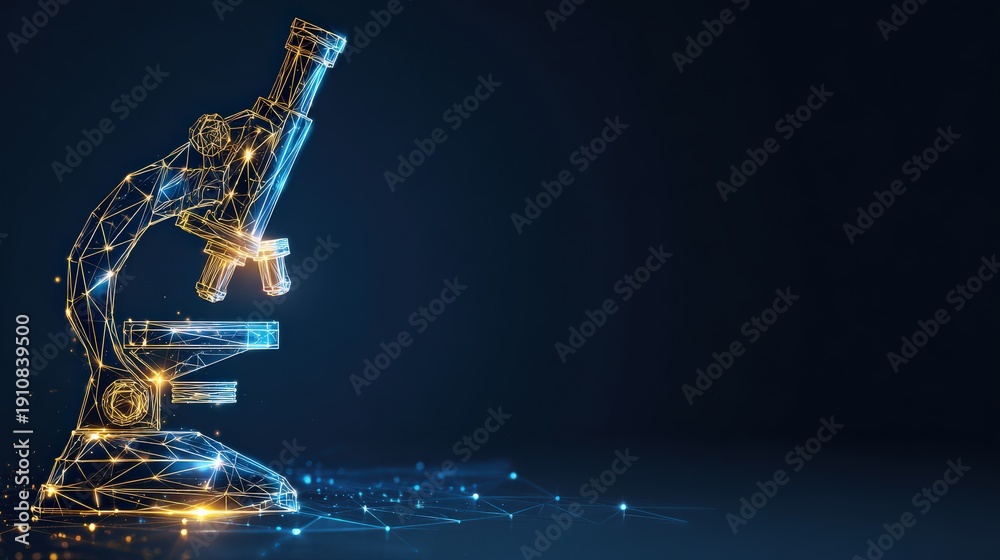 A captivating digital rendering of a laboratory microscope against a dark blue background. Representing the realms of science, research. ..Created with Generative AI, not depicting real subjects. #1910839500