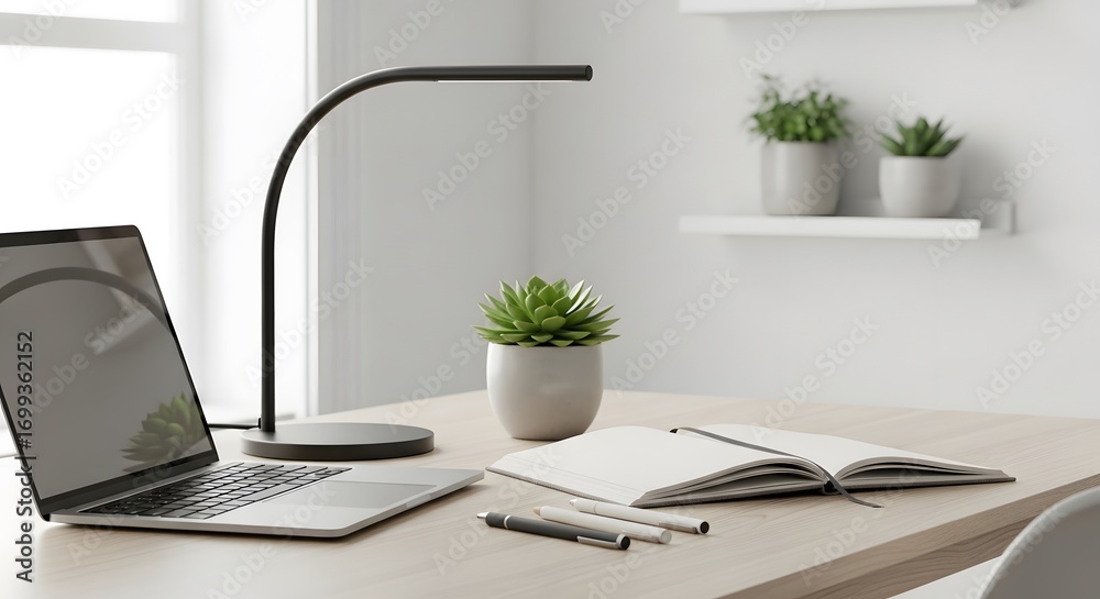 A clean, minimalist workspace featuring a silver laptop, black desk lamp, succulents in white pots, and an open notebook on a light wood desk. Bright, natural light. #1699362152