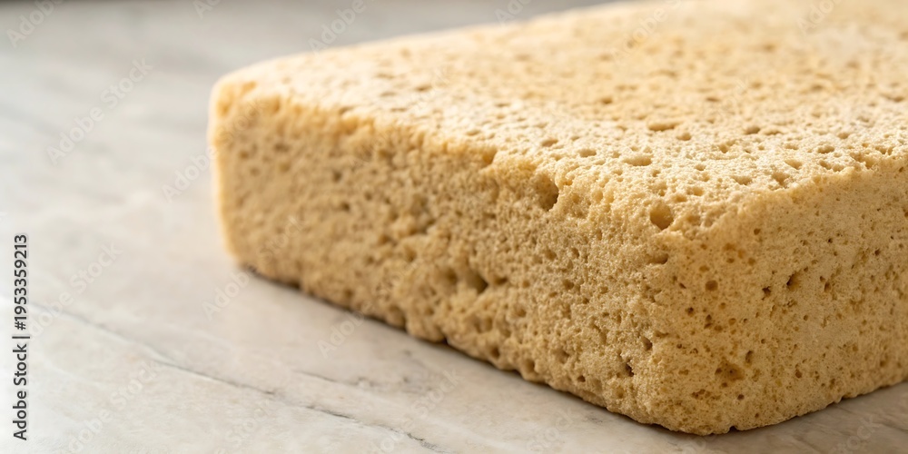 A close up macro shot of a single rectangular porous beige cleaning sponge on a marble surface #1953359213