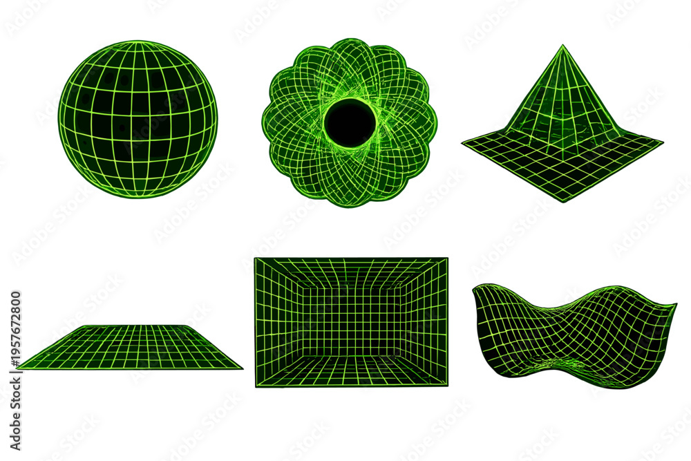 A collection of six neon green wireframe 3D geometric shapes isolated #1957672800