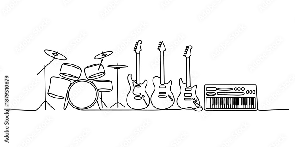 A continuous line drawing illustrating a complete set of musical band instruments Vector, illustration #1879310679