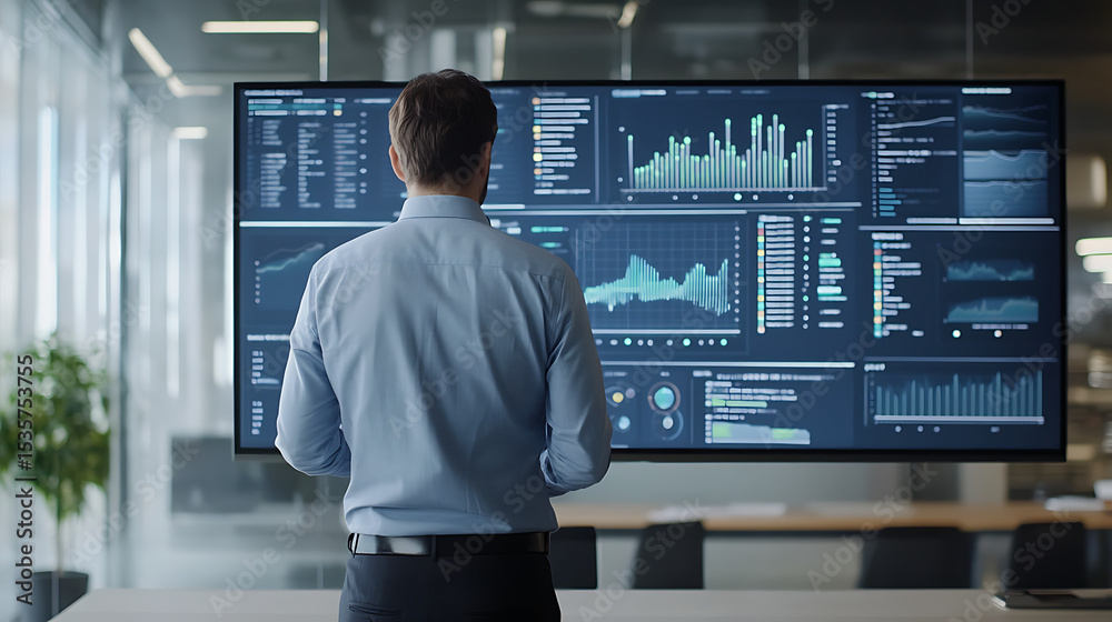 A corporate data management expert analyzing real-time financial and business data on a large digital screen, showcasing market trends, analytics, and strategic insights in a modern office #1535753755