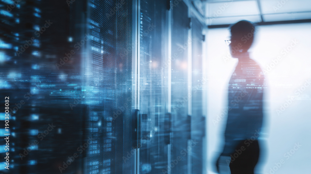 A data scientist stands inside a server room with futuristic digital overlays analyzing the information from rows of rack mounted servers. #1903008082