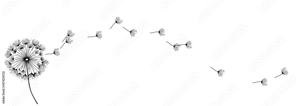 A delicate dandelion vector art on a white background, featuring fine lines and soft details. The floating seeds evoke a sense of freedom, renewal, and nature's fleeting beauty in a minimalist design. #1474224722